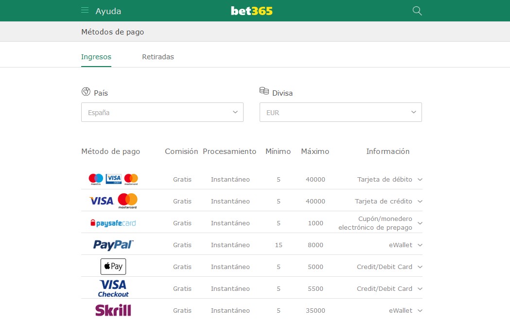 Bet365 cuenta con multitud de métodos de ingreso y retiro, como por ejemplo los mencionados en la captura anterior, Vista, Mastercard, Maestro, Paysafecard, PayPal, Google Pay, Trustly y Wire entre otros. Sin embargo, esto puede cambiar dependiendo del país en el que te encuentres, así que puedes consultar esta lista en función de tu país o divisa a través del siguiente enlace: