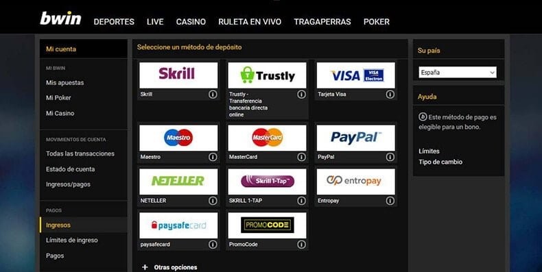 Si queremos realizar un depósito en Bwin tenemos las siguientes opciones:
