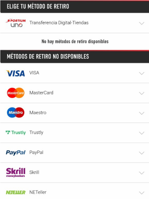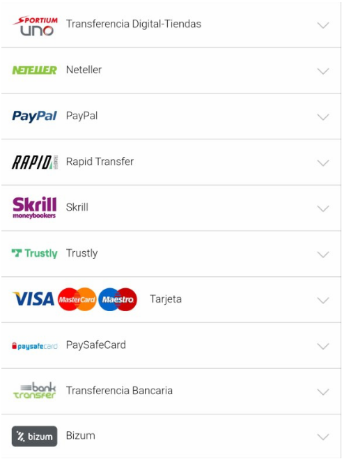 Aunque pueden variar en función de tu método de ingreso, son también muy amplios, pudiendo incluso cobrar el dinero en efectivo en los locales de Sportium.